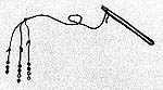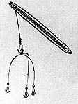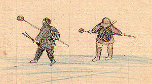 Once when Woodlet got only a few fish, some superstitious person said it was because she carried a gunny sack instead of a seal skin bag to bring home the fish, usually tomcod or flounder. When fishers go to a new place they drill a hole through ice three to five feet thick. They have an ice drill, a sharpened piece of iron on a long pole. This breaks the ice up fine and they scoop it out with an ice scoop and break more. They build a wall of blocks of snow on three sides of this to protect themselves from the wind. The fish pole is about two feet long. The hooks are four sharp points in an ivory body. The sinker is a decoy of stone or ivory with beads for eyes and they use no bait. They keep the line bobbing up and down in the hole until a fish is caught by his fin or tail or some other part of his body. They draw it up by winding the line on the pole and another stick until the fish comes to the top. Then they knock it off and it freezes to death as it lies in a pile From Ice Window, p. 105 |