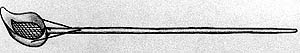 Once when Woodlet got only a few fish, some superstitious person said it was because she carried a gunny sack instead of a seal skin bag to bring home the fish, usually tomcod or flounder. When fishers go to a new place they drill a hole through ice three to five feet thick. They have an ice drill, a sharpened piece of iron on a long pole. This breaks the ice up fine and they scoop it out with an ice scoop and break more. They build a wall of blocks of snow on three sides of this to protect themselves from the wind. The fish pole is about two feet long. The hooks are four sharp points in an ivory body. The sinker is a decoy of stone or ivory with beads for eyes and they use no bait. They keep the line bobbing up and down in the hole until a fish is caught by his fin or tail or some other part of his body. They draw it up by winding the line on the pole and another stick until the fish comes to the top. Then they knock it off and it freezes to death as it lies in a pile From Ice Window, p. 105 |