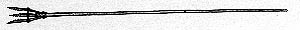 Fishing line with lures and hooks, simple line and lure, ice drill, ice scoop, and barbed spreading-tined spear.